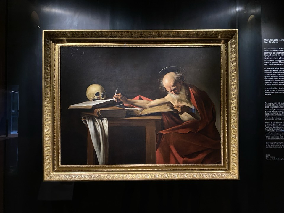 Dopo aver ospitato celebri dipinti provenienti dai principali musei nazionali e internazionali, per la prima volta nella Basilica Palladiana verrà esposto uno dei quadri più importanti al mondo, il San Girolamo di Michelangelo Merisi detto Caravaggio, realizzato nel 1606 e custodito nella celebre Galleria Borghese a Roma. Nel dipinto San Girolamo è raffigurato come uomo di studi dedito alla conoscenza. I toni freddi e caldi della tela evocano il rincorrersi degli opposti, la vita e la morte, il passato e il futuro e, in generale, lo scorrere inesorabile del tempo.