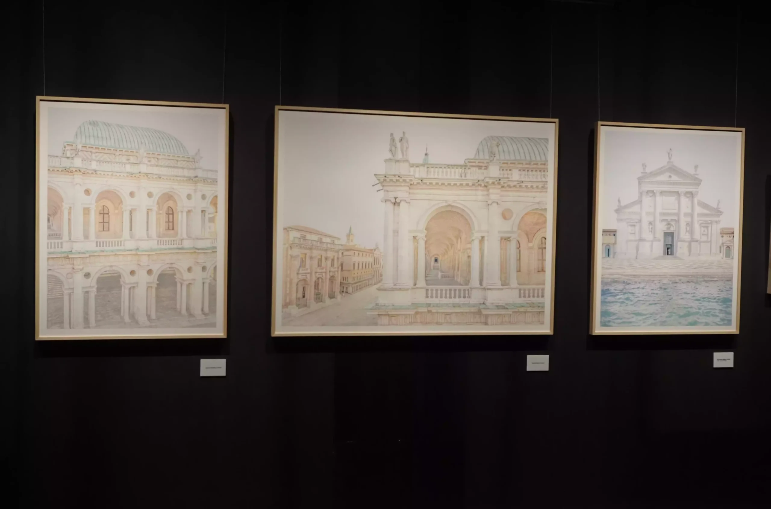 A Vicenza sono esposti sei nuovi lavori: Piazza dei Signori di Vicenza, omaggio alla città palladiana. E poi l’Arena di Verona, le Procuratie di Venezia, il Parlamento Subalpino a Palazzo Carignano di Torino e l’Ara Pacis di Roma.
